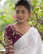 Elegant plum blouse in soft Vichitra silk , adorned with zari floral and leaf embroidery.