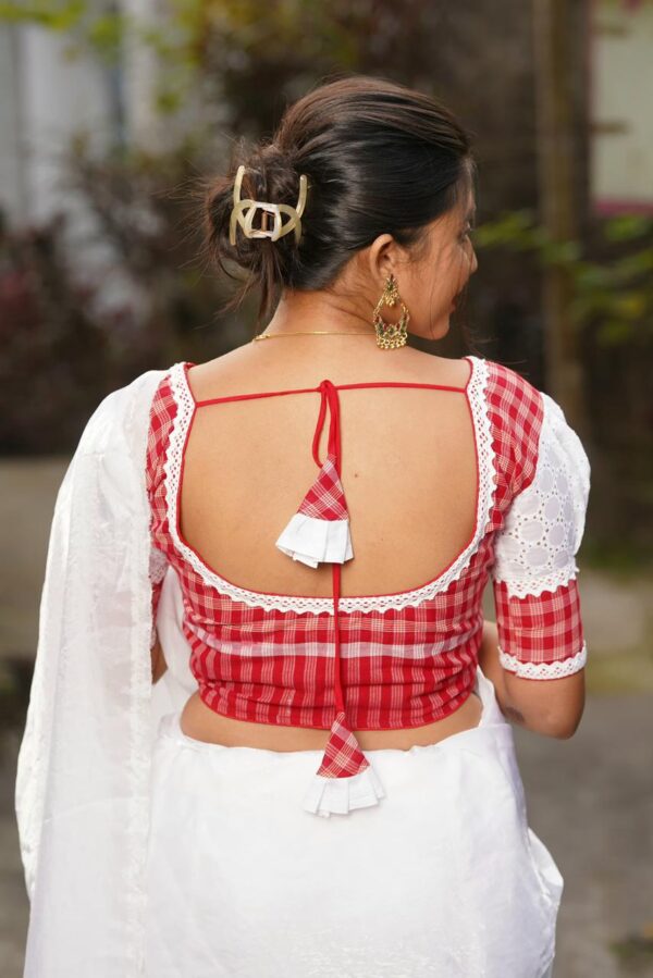 The gamcha-style pattern gives the blouse a distinctive ethnic character, making it stand out with understated grace. Designed for ease and versatility, Gramina pairs beautifully with cotton sarees, handloom drapes, and traditional everyday styling.