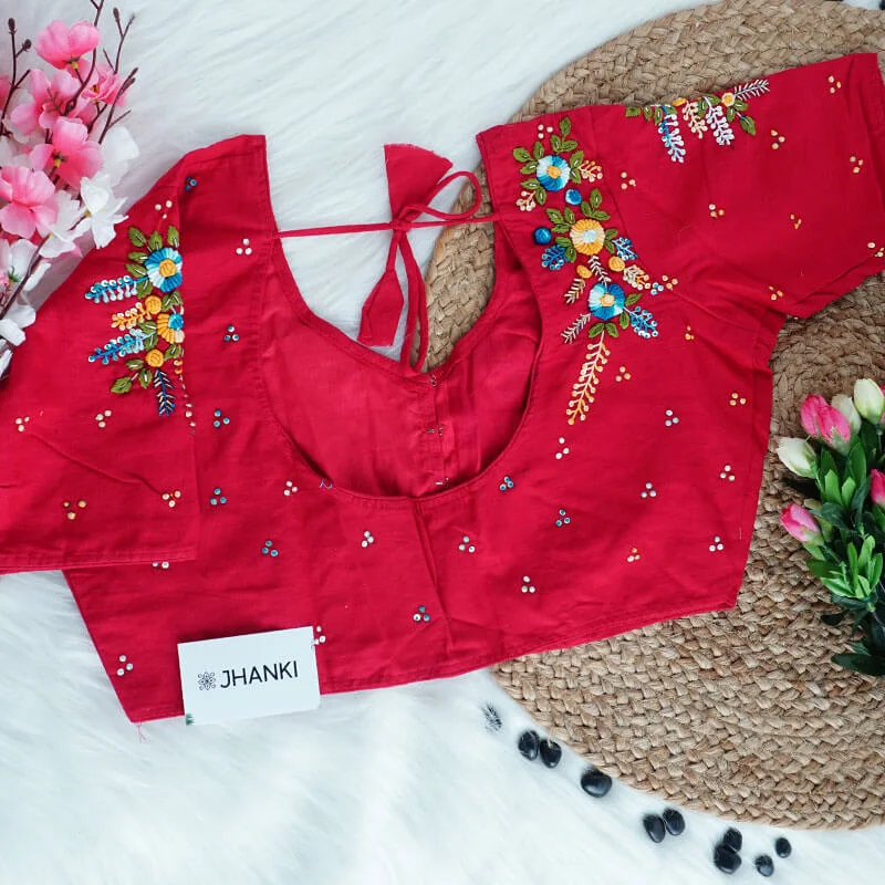 Crafted from breathable cotton, this blouse features intricate all-over thread work, blending comfort with timeless elegance.