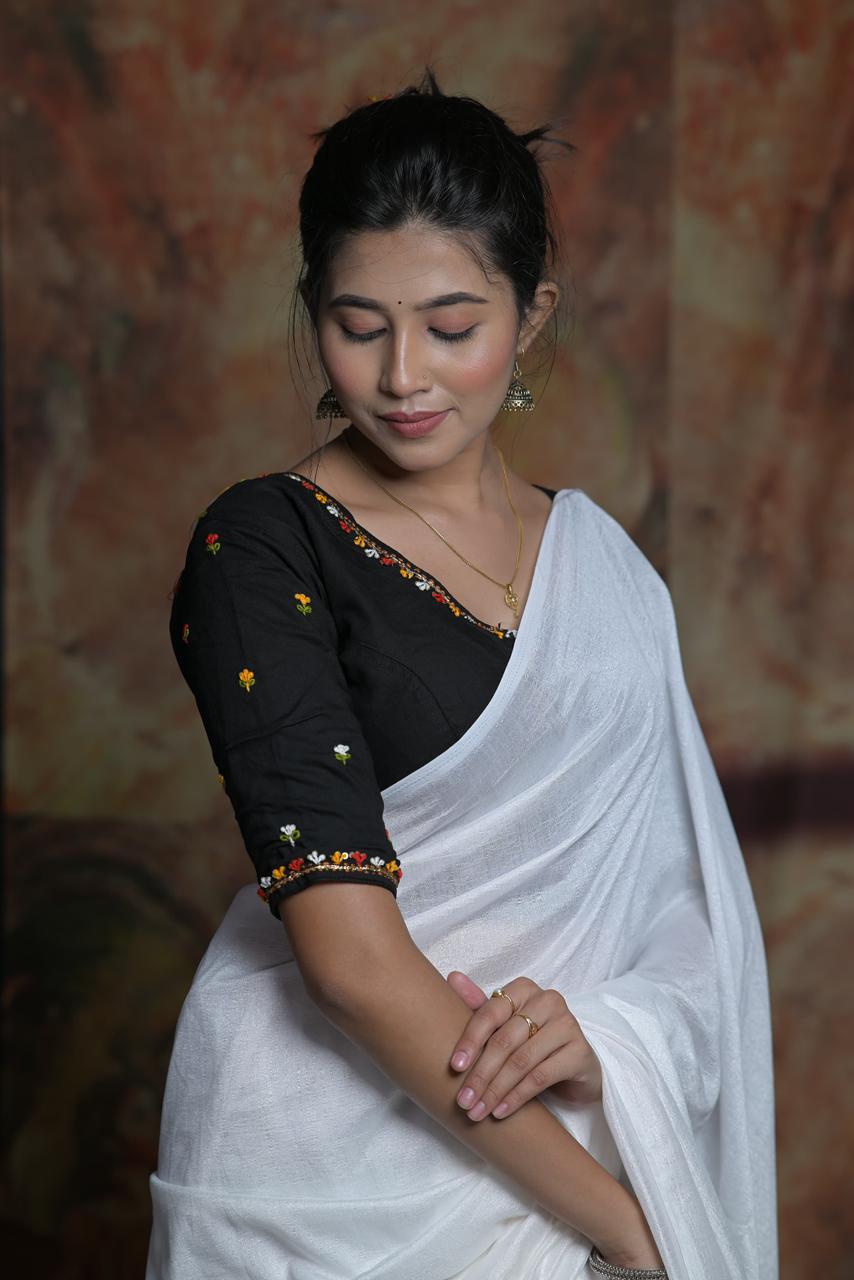Kusuma is a beautifully crafted silk blouse designed for women who love artistic detailing with a graceful finish. The blouse showcases machine-embroidered floral motifs across the sleeves, neckline, and back, creating a rich yet balanced ethnic look.