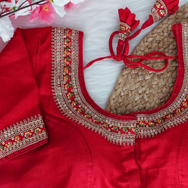 Crafted from premium Pashmina silk, this blouse features delicate floral embroidery along the neckline and sleeve borders, blending simplicity with timeless elegance.