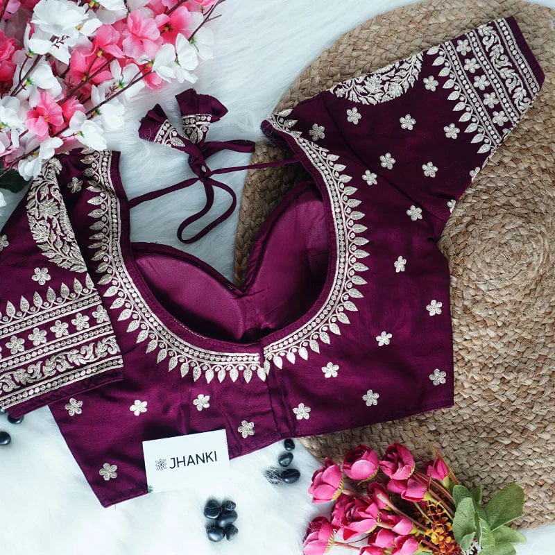 Crafted from premium Vichitra Silk. Featuring intricate zari embroidery and delicate floral work, it boasts an eye-catching deep back cut with tassel tie-ups.