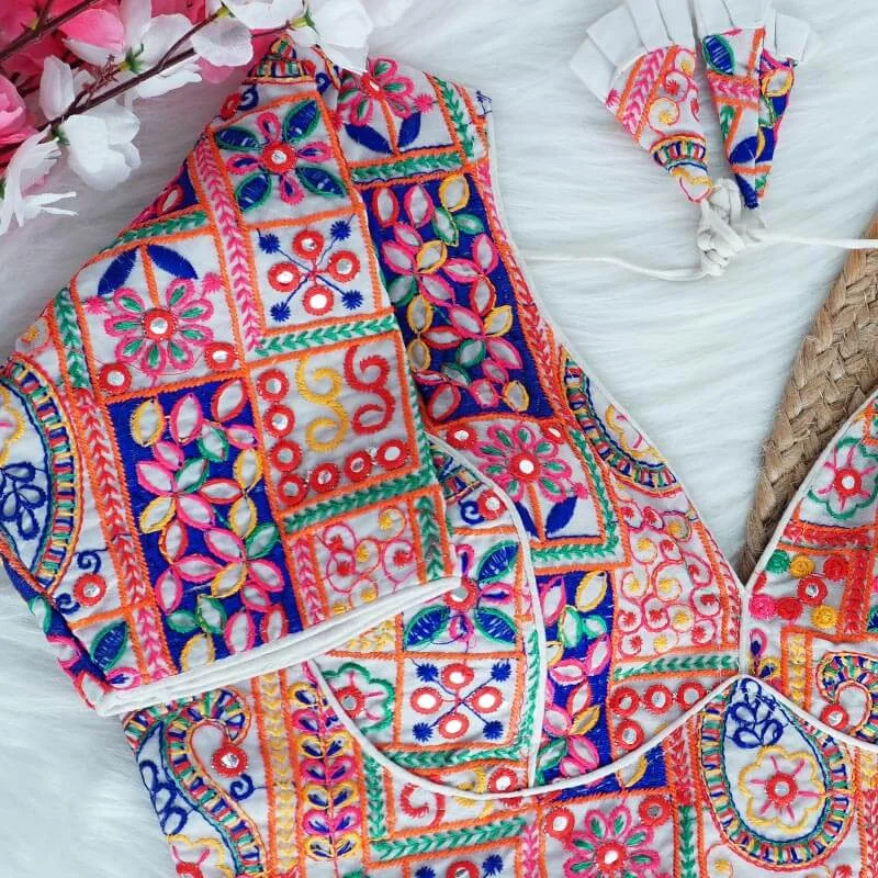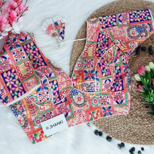 A vibrant multicolor blouse featuring intricate thread embroidery work.