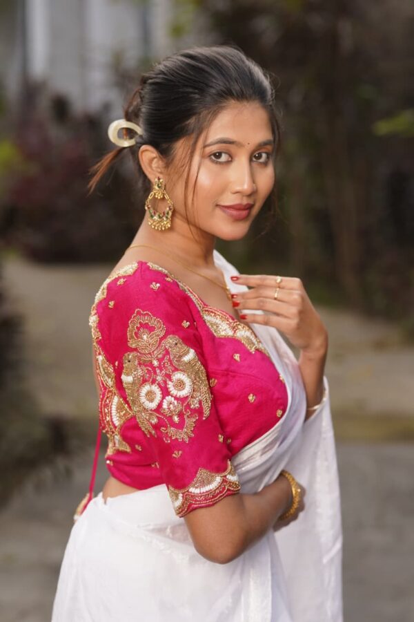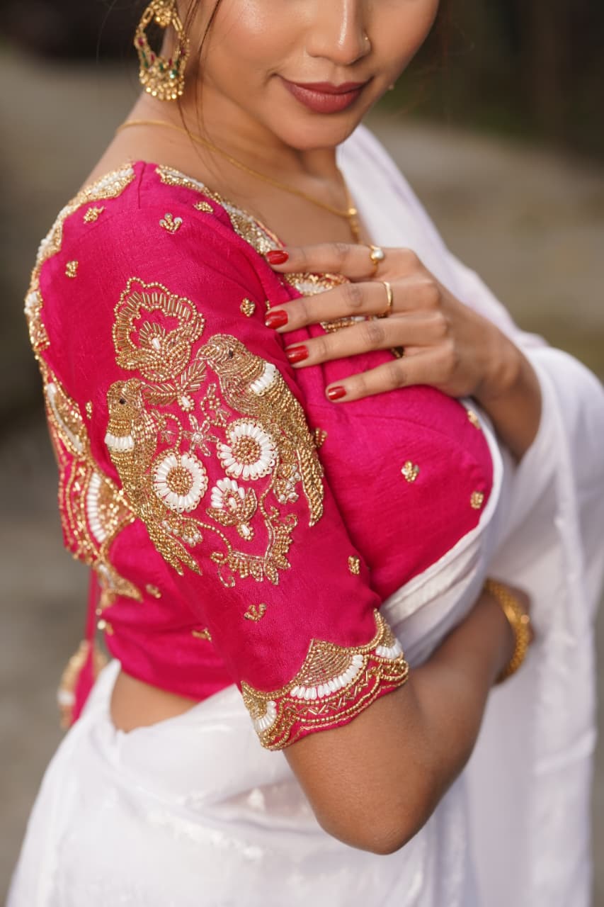 Samskara is an exquisitely designed malai silk blouse created for women who admire fine hand embroidery and timeless ethnic aesthetics. The blouse showcases detailed aari handwork on the sleeves, neckline, and body, enhanced with delicate motif placement that adds richness without overpowering the design.