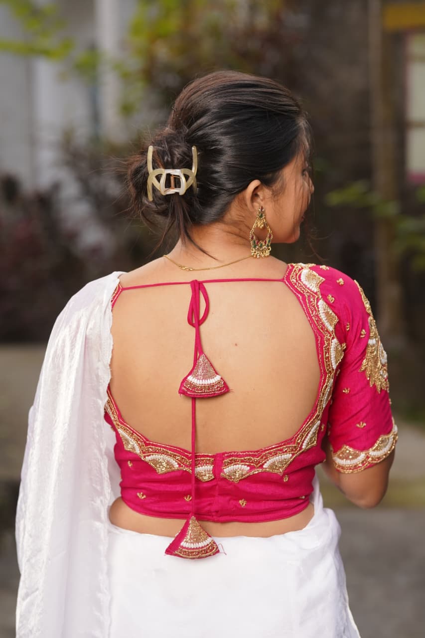 The deep back pattern with classic dori tie-up and handcrafted tassel detailing brings a graceful traditional finish. This blouse pairs effortlessly with silk, banarasi, and designer sarees, making it a versatile choice for weddings and festive occasions.