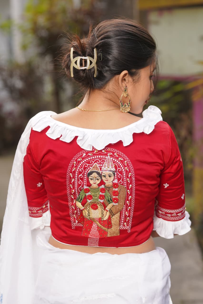 Sanjhita is a beautifully designed malai cotton blouse created for women who love comfort blended with cultural artistry. The blouse showcases traditional embroidered motif work on the back, complemented by delicate detailing on the sleeves and neckline.
