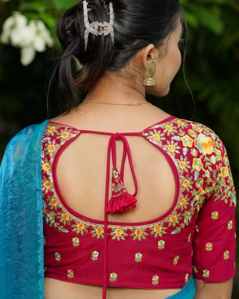 Colorful floral embroidery in yellow, blue, and green tones. Features a stylish oval back cut with dori tie-up and elbow-length sleeves.