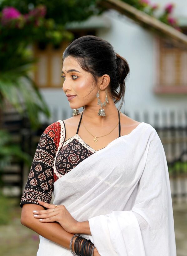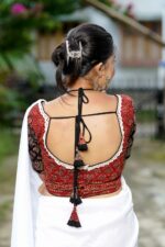 The open back design with dori tie-up enhances its appeal while ensuring a comfortable and adjustable fit. Lightweight and breathable, this blouse is perfect for long wear and pairs beautifully with cotton, handloom, and soft silk sarees.