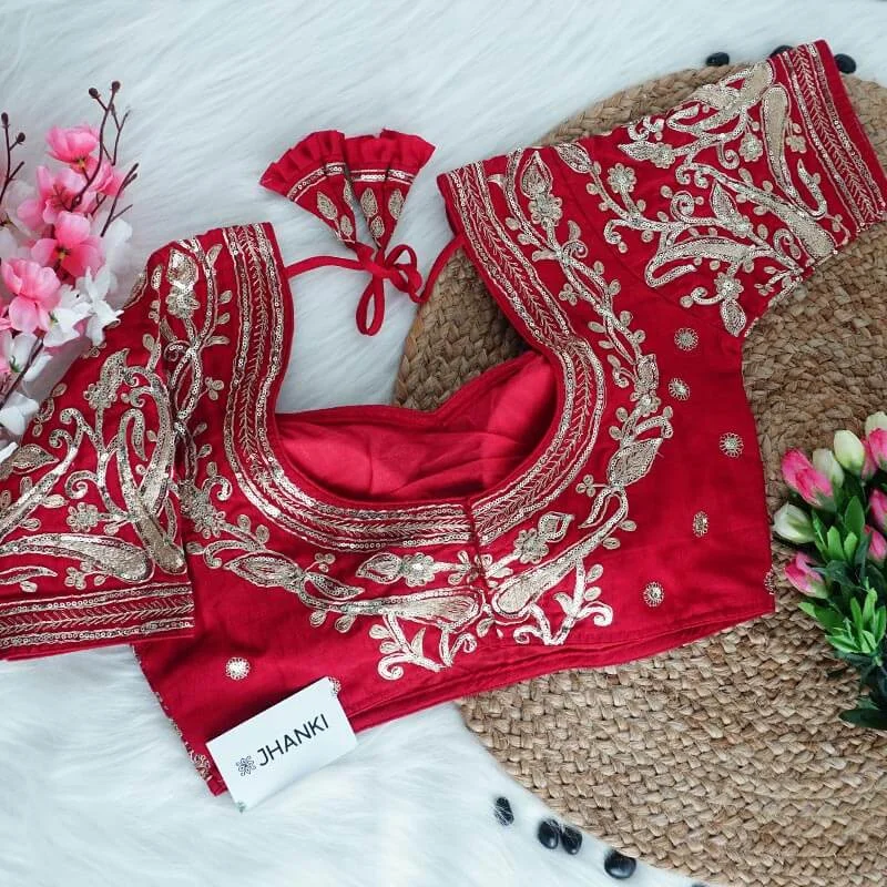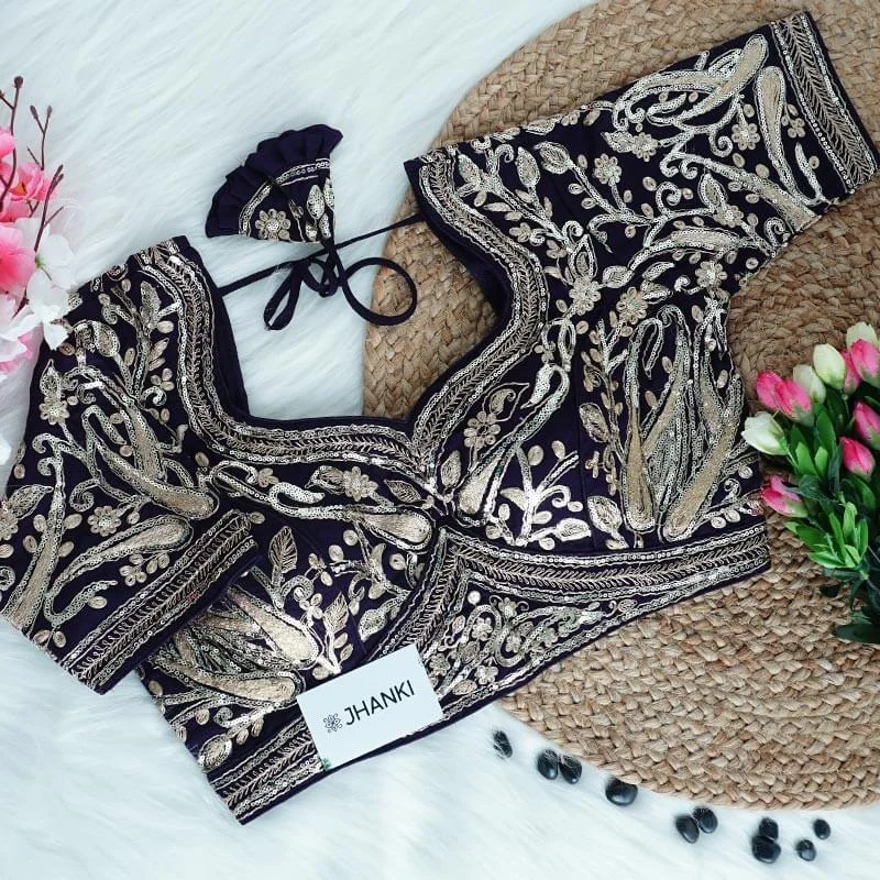 This premium blouse featuring intricate zari work all over. Designed with a flattering neckline, it exudes elegance and sophistication—perfect for special occasions