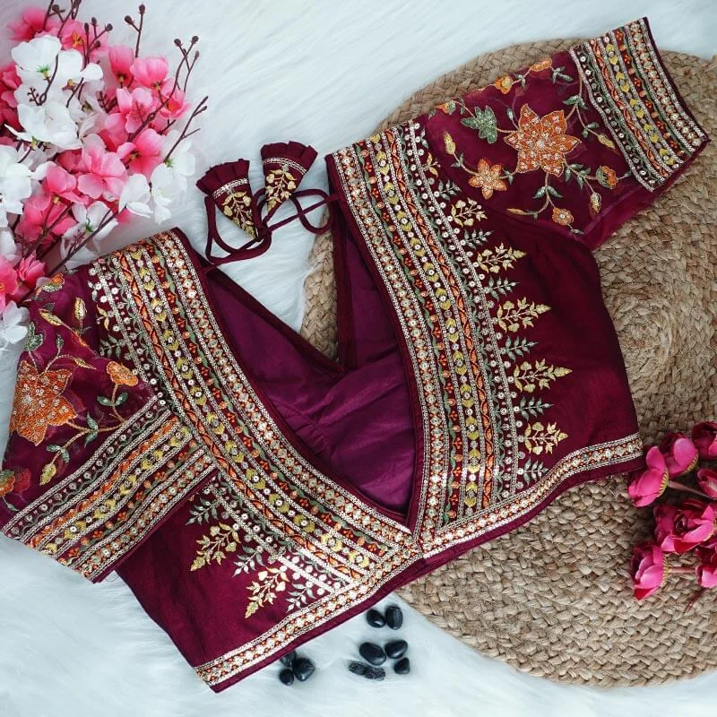 Deep V-neck designer blouse with handcrafted floral motifs and sequin embellishments.