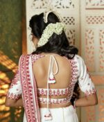 The design features a deep back with stylish double strap detailing and dori tassel, creating a modern layered back style while maintaining traditional elegance. The sleeves and neckline are decorated with intricate embroidery, making this blouse perfect for bridal wear, weddings, festive celebrations, and traditional occasions.